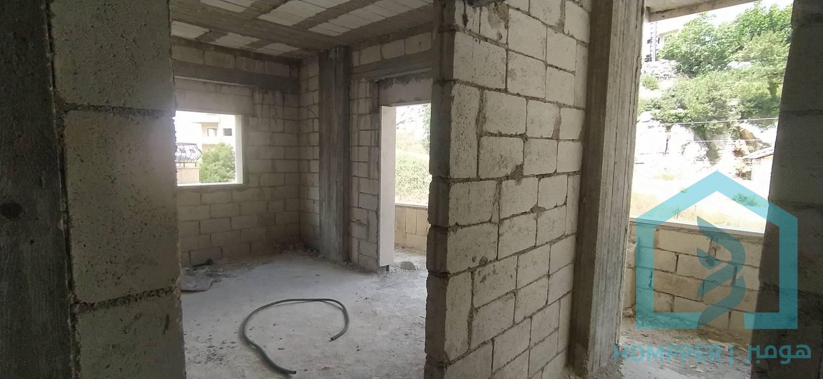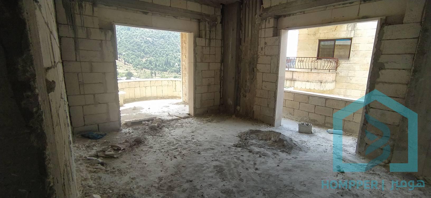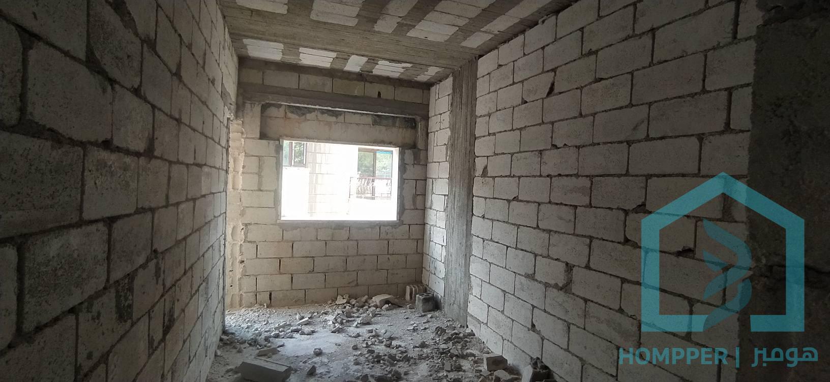 بمساحة 115متر مؤلفة من غرفتين وصالون أطلالة مميزة جدا تجهيز على العضم مقطعة بلوك ملبسة حجر الماء والكهرباء واصلة لمدخل الشقة طابو أخضر سند تمليك طابق اول فني