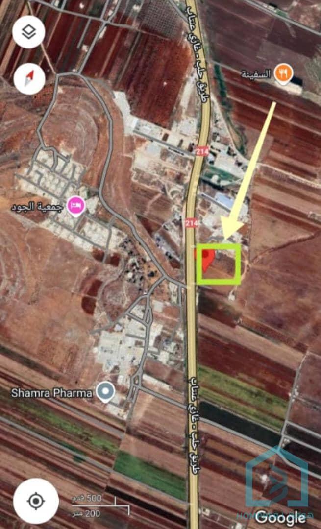 الريف الشمالي للبيع أرض على استراد حلب غازي عنتاب بين بيانون والزهراء المساحة 5880 متر واجهة 42 متر طول 140 متر فراغة طابو تمام العقار